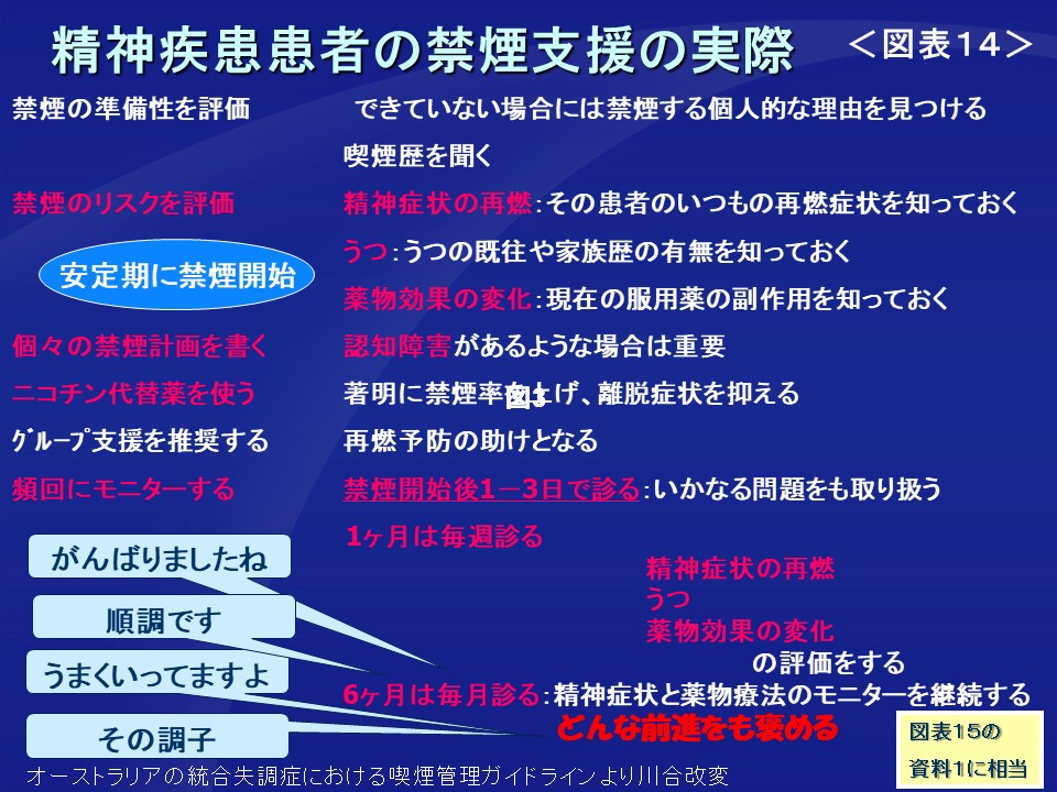 精神疾患患者の禁煙治療も基本的には非精神疾患患者と同じである。喫煙の有無を聞き、吸っている場合には禁煙を勧める。ただし、外来患者では精神症状が落ち着いているときに開始する。精神疾患患者の禁煙支援のキーワードは「信頼関係」「こまめな診察」「長期のフォロー」「精神科医との連携」「薬物療法」「家族・周囲のサポート」「環境」が重要なポイントである(図表14)。以下に概説する。